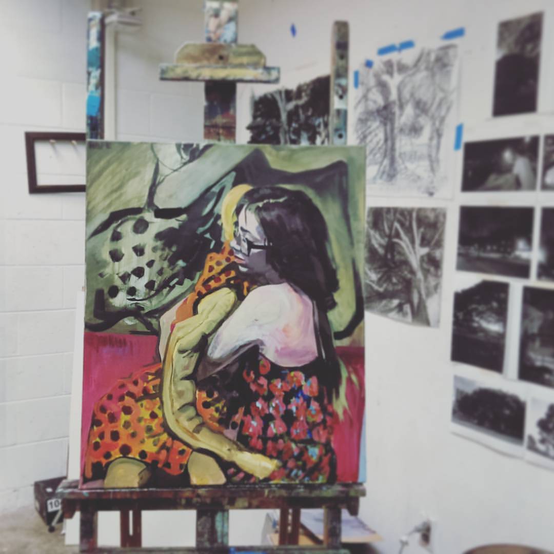 Printmaker, performance artist Terra Keck holding her doll, acrylic on canvas, 2015, Honolulu, USA